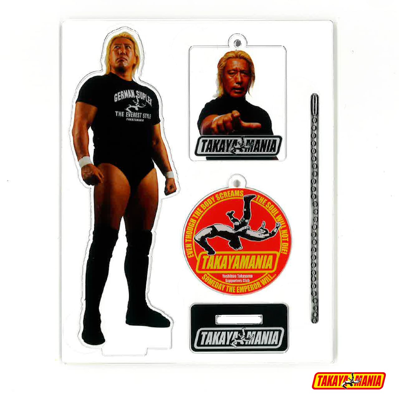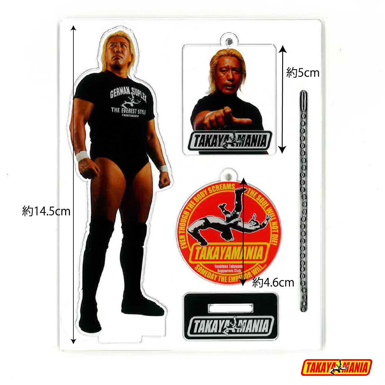 アクリルスタンドになって帝王降臨です! アクリルスタンド1体にアクリルキーホルダー2点、ボールチェーンが1個付いてきます。 アクリルスタンドは帝王サイズの約14.5cmで少し大きめになっています。 また、本サイトで販売された商品の売り上げは「TAKAYAMANIA」に寄付され、髙山善廣選手の治療費等に充てられます。